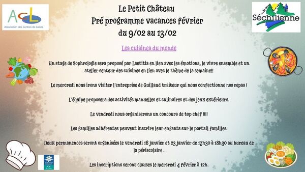 Au programme : atelier senteur, visite traiteur, concours Top Chef, intervention de Laetitia Monteferrario Sophrologue, activités créatives et jeux extérieurs et plein de surprises seront au rendez-vous !